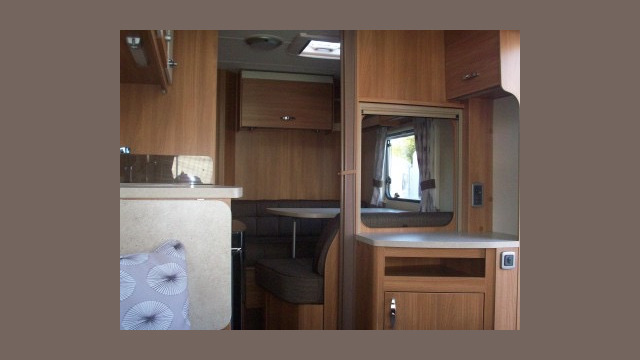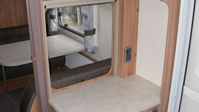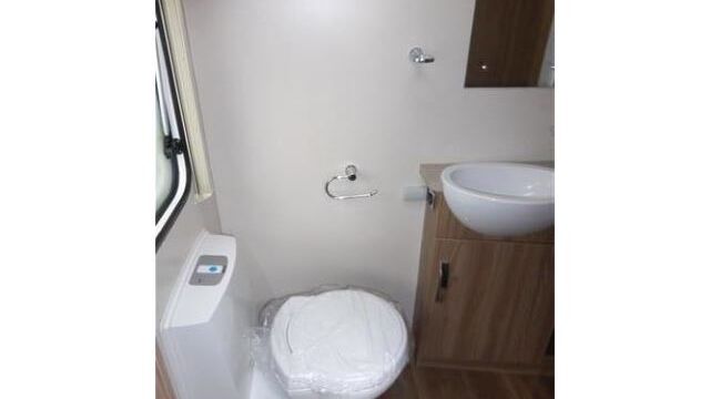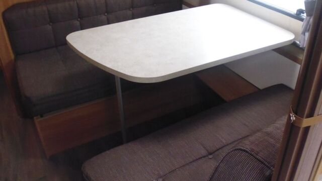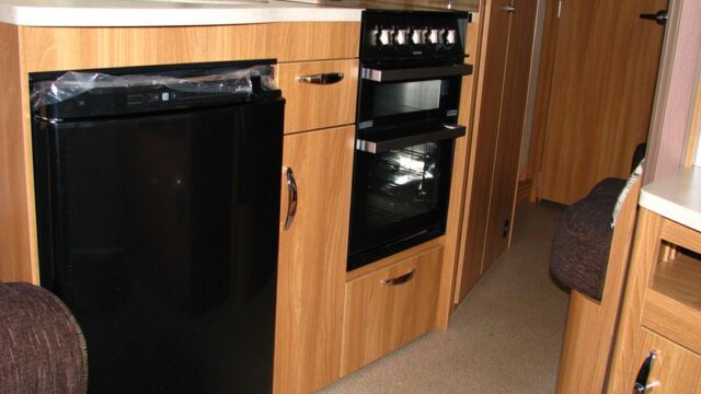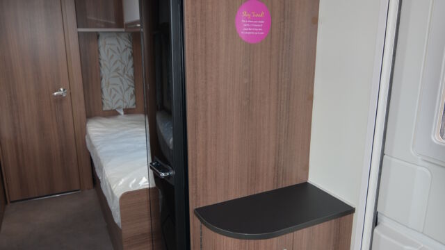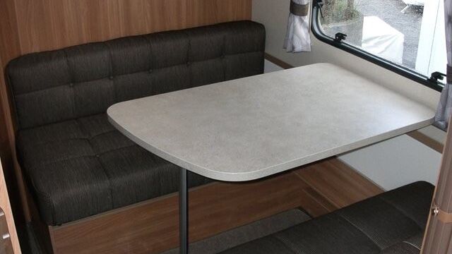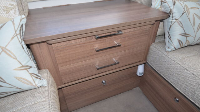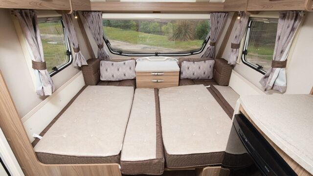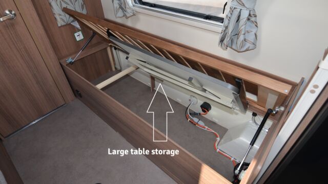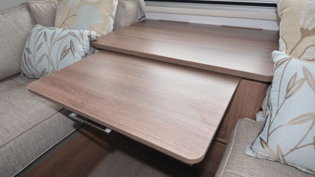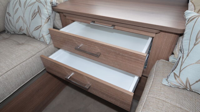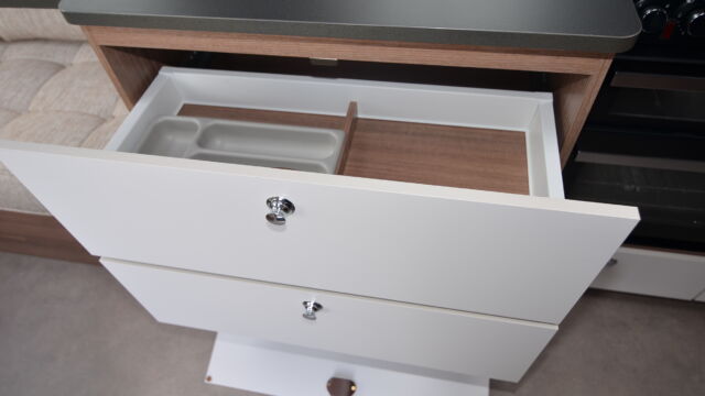 Appliance-wise you’ll find see a spacious Dometic tower refrigerator and a Thetford Caprice cooker which features an oven, grill and hob. Above the hob is a handy microwave for meals in a hurry. The three-burner hob and the single electric hotplate is covered with a proper worktop surface, meaning your worktop space is almost doubled when the hob is not in use. The sink also turns into a usable space when you’re not busy washing up. It’s supplied with two covers, a chopping board and a draining board to make the most of the space you have.