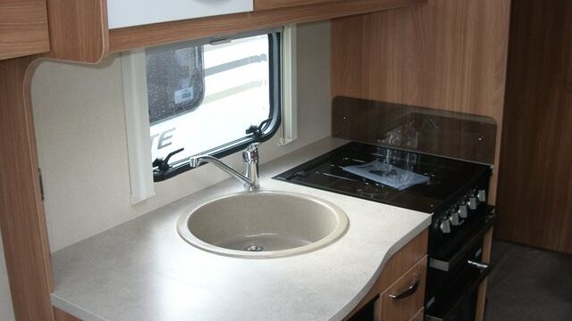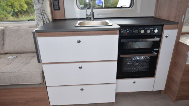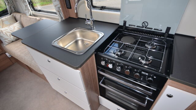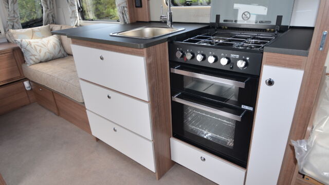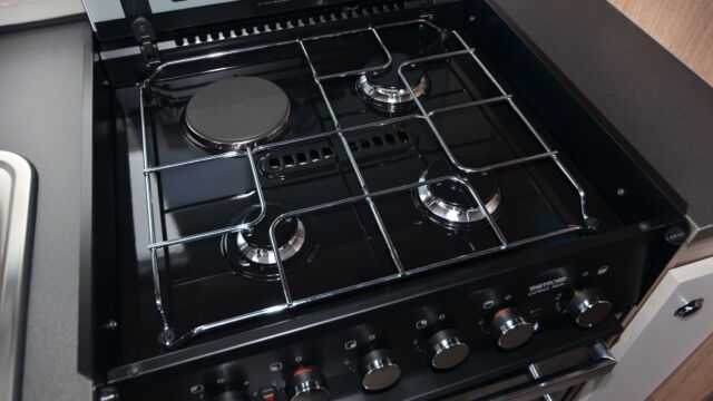 Appliance-wise you’ll see an under-counter Dometic refrigerator and a Thetford oven, grill and hob. Above the hob is a handy microwave for meals in a hurry. The three-burner hob is placed above the oven, adjacent to the sink also turns into a usable space and included a fitted round bowl.