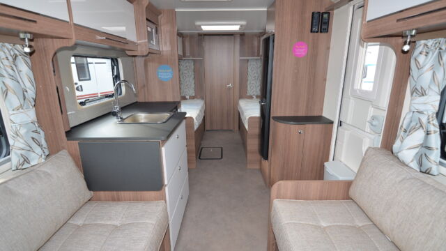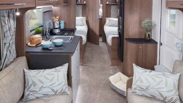 The Unicorn Cadiz was designed for families of four, with an optional double bed, and fixed twin beds towards the rear of the caravan. The under locker spotlights around the caravan double up as USB points for charging your devices, with close by wall pockets to keep them stored as they charge. The two sofas which run parallel easily fold out to make up the front double bed. Large overhead lockers provide vast storage above both twin beds. At the head of the twin beds, you’ll find a headboard and another USB point to charge your devices overnight, there’s even a handy shelf just above to keep them. Two sunroofs allow natural light to flood in from the ceiling. This room is easily closed off from the rest of the caravan with a sliding door. At the front of the caravan is a large living area, flanked by overhead lockers offering yet more storage.