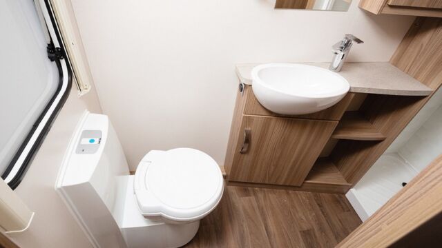 At the very rear of the caravan, through the walkway of the twin beds. you’ll find a large bathroom. In place of a window, you’ll find a large mirror which bounces light around the room and provides a spacious feeling.
